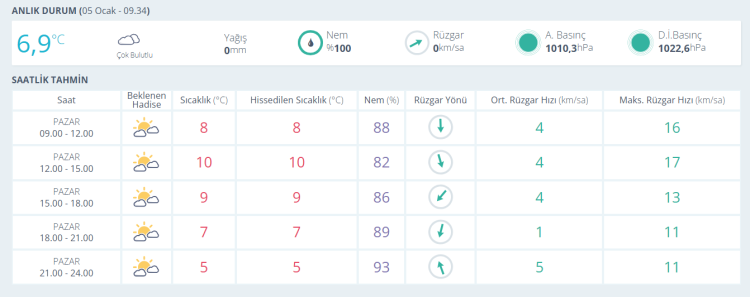 Yapılan son değerlendirmelere göre, ülke genelinin parçalı ve çok bulutlu, İç Anadolu (Eskişehir hariç), Karadeniz, Doğu Anadolu, Güneydoğu Anadolu'nun güney ve doğusu ile Kocaeli, Sakarya, Kütahya, Muğla, Antalya, Isparta ve Hatay çevrelerinin yağışlı geçeceği tahmin ediliyor. Yağışların, Orta ve Doğu Karadeniz kıyıları, Amasya ve Tokat çevreleri ile Hatay'ın güney kıyılarında kuvvetli olmak üzere genellikle yağmur ve sağanak, İç Anadolu’nun kuzeydoğusu, Karadeniz’in iç kesimleri, Doğu Anadolu ile Güneydoğu Anadolu’nun kuzeydoğusunda karla karışık yağmur ve kar şeklinde olması bekleniyor. Ülkenin iç ve doğu kesimlerinde buzlanma ve don olayı ile birlikte pus ve yer yer sis görüleceği tahmin ediliyor. Doğu Karadeniz’in iç kesimlerinin yüksekleri ile Doğu Anadolu’nun yüksek ve dik yamaçlarında çığ tehlikesi bulunmakta.