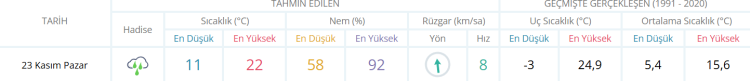 Nem oranının gün boyunca yüzde58 ile yüzde 92 arasında değişeceği tahmin edilirken, rüzgârın düşük seviyede kalacağı ve yaklaşık 8 km/sa hızla eseceği bildirildi.