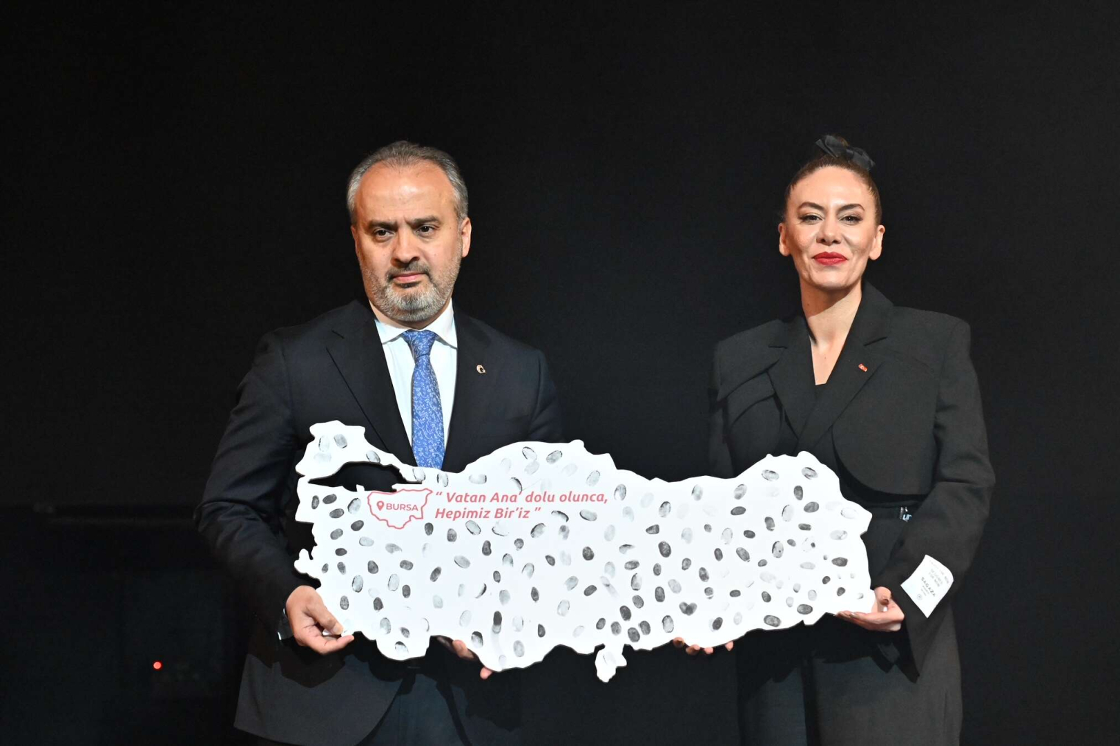 Programın sonunda okunan İstiklal Marşı’na tüm salon büyük bir coşkuyla eşlik ederken, projenin mimarı Ehli Sanat Derneği yöneticisi Eda Sürmeli, etkinlik öncesi fuaye alanında hazırlanan ve tüm kadınların parmak izlerini taşıyan Türkiye Haritası panosunu da Başkan Aktaş’a hediye etti.