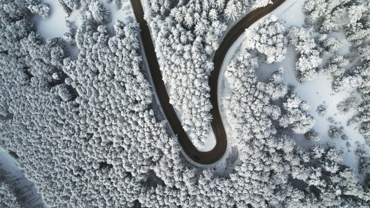 Bursa Uludağ'daki yollar, dron ile havadan görüntülendi. Karla kaplı manzara, doğa ve fotoğraf meraklılarının ilgisini çekti. Virajların simetrik desenleri ve karlı ağaçlar, eşsiz bir görsel şölen sundu.