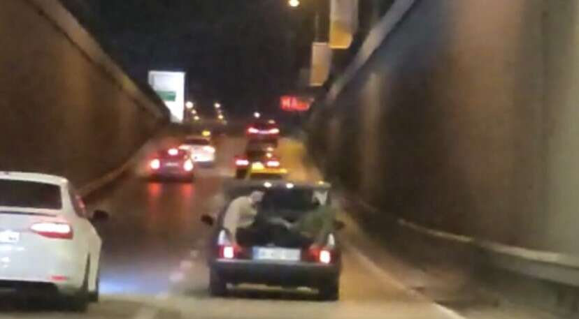 Edinilen bilgiye göre, arabada yer kalmayınca 2 genç çareyi bagaja oturmakta buldu. Trafikteki diğer sürücüler bagajda oturan gençleri görünce gözlerine inanamazken, o anlar cep telefon kamerasına yansıdı.