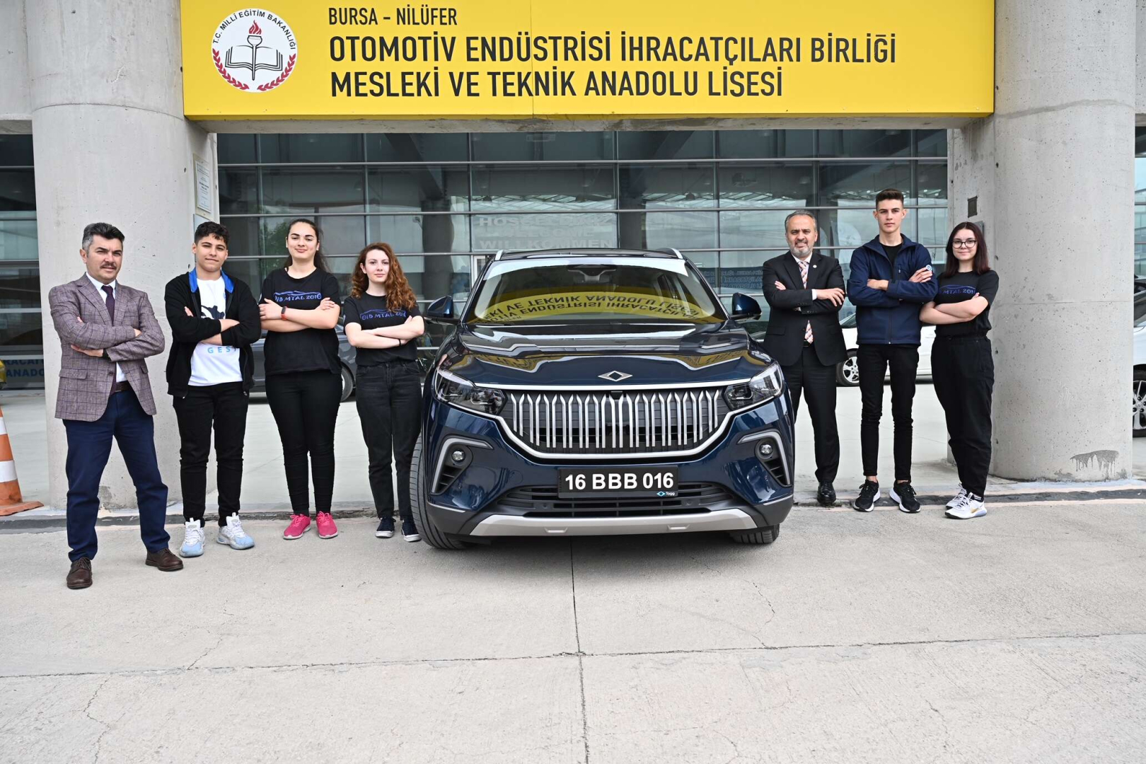Otomotiv sektörünün nitelikli iş gücü ihtiyacını karşılamak üzere Bursa’da kurulan Türkiye'nin ilk otomotiv lisesi, Otomotiv Endüstrisi İhracatçıları Birliği Mesleki ve Teknik Anadolu Lisesi’nde geçtiğimiz hafta düzenlenen festivale katılan Büyükşehir Belediye Başkanı Alinur Aktaş, Büyükşehir’e gelecek Togg’u ilk olarak bu okula getireceğine dair öğrencilere söz vermişti. Başkan Aktaş, dün gelen Togg ile birlikte ilk yolculuğunu da geleceğin otomotivcilerini yetiştiren bu okula yaptı. Öğrenciler tarafından okulun girişinde Türk Bayrakları ile karşılanan Togg, büyük heyecan uyandırdı.