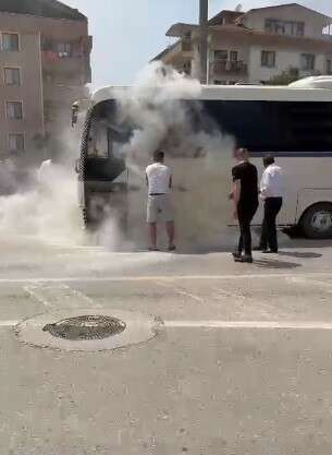 Bursa'nın Yenişehir ilçesinde içerisi işçi dolu servis midibüsünden seyir halindeyken dumanlar çıkmaya başladı. Alt kısmından alev alan servisi, vatandaşlar araçlarından çıkardıkları yangın tüpleri ile söndürdü.