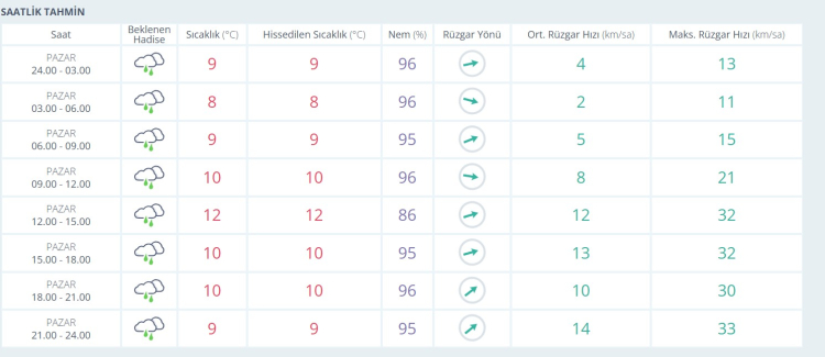 Özellikle saat 15.00’ten itibaren rüzgarın hızını artırarak saatte 33 kilometreye kadar ulaşması öngörülüyor. Pazar keyfi için dışarı çıkacak vatandaşların, gün boyu sürecek yağışa ve akşam etkisini artıracak rüzgara karşı tedbirli olmaları, şemsiyelerini yanlarından ayırmamaları tavsiye ediliyor.