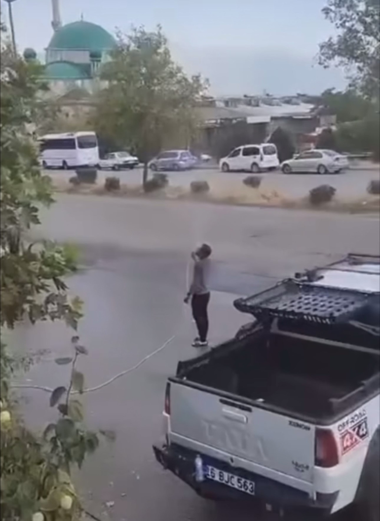 Hava sıcaklığının 35 dereceleri gördüğü Bursa'da vatandaşlar sıcaktan bunalınca yüzleri gülümseten bir yöntemle serinledi. Bir vatandaşlar sıcaktan iyice bunalınca aldığı hortumla sokak ortasında kendisini serinletti. O anları arkadaşı ise gülerek kayda altı.