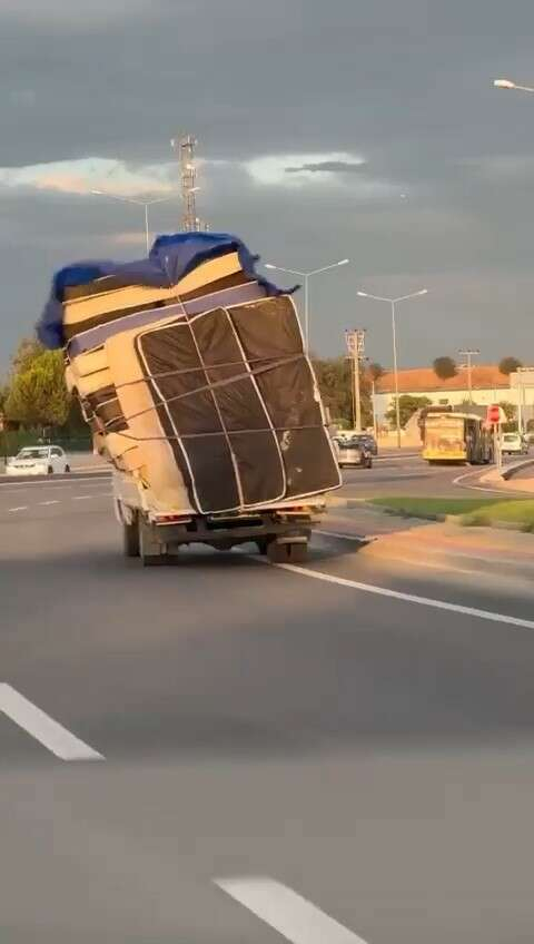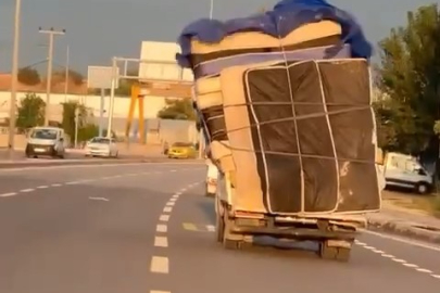 Bursa'nın Osmangazi ilçesi Ankara Yolu Caddesi üzerinde seyir halinde olan açık kasa kamyonetin sürücüsü, aracın kasasına yüklediği aşırı yükle trafiği tehlikeye attı.