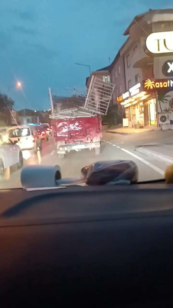 Bursa’da açık kasa kamyonete fazla ve kontrolsüz malzeme yükleyip dakikalarca yolculuk yapan sürücü hem kendini hem çevredekileri attı.