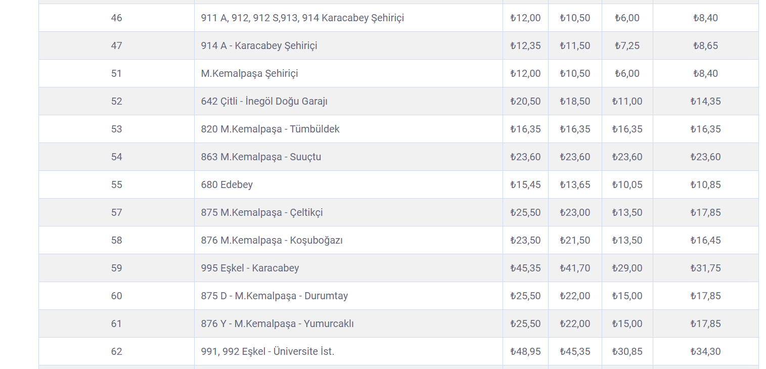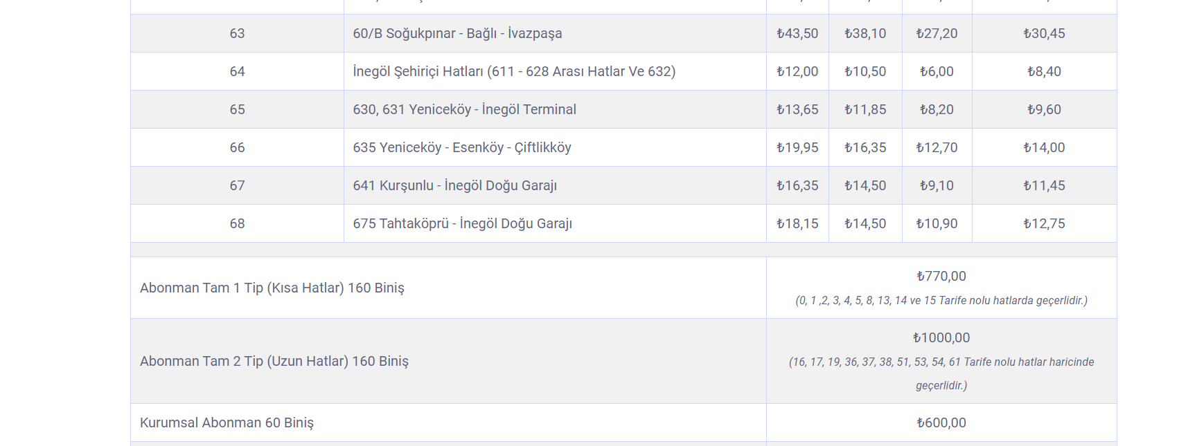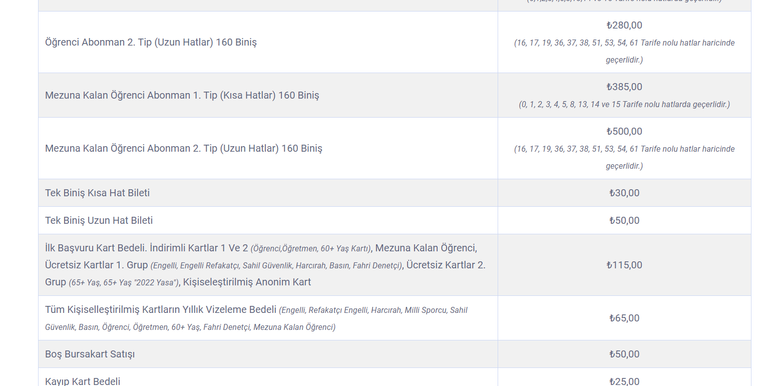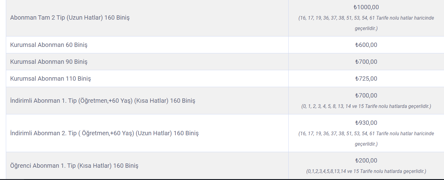 Aylık 160 binişlil ABONMAN KARTI ise kısa hatlar için 520 TL'den 770 TL'ye, uzun hatlar için 690 TL'den 1000 TL'ye yükseltildi.