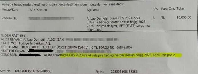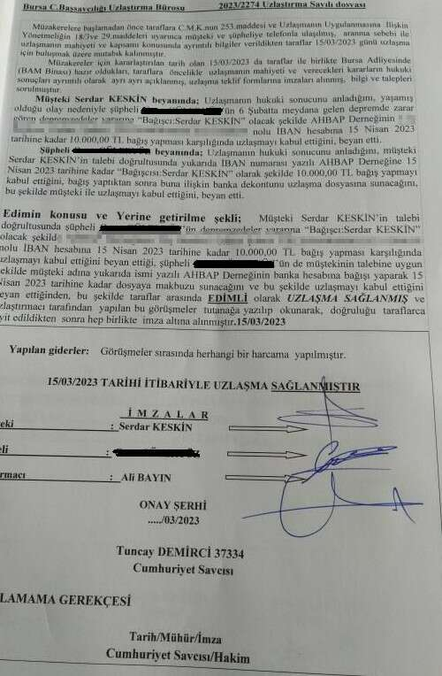 Mağdur Serdar Keskin de davanın uzamaması ve avukat ücretlerinin çıkmaması için bu teklifi kabul etti. Karşı taraf 10 bin lirayı bir yardım derneği aracılığı ile depremzedelere gönderince Keskin davadan vazgeçti.