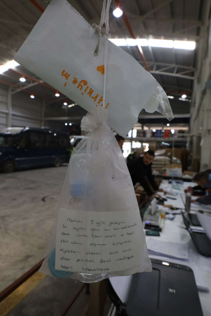 Antakya Mobilyacılar Sitesi’ndeki 10 bin metrekarelik alanda oluşturulan yardım merkezinde, Türkiye’nin dört bir tarafından ‘depremzedelere ulaştırılmak üzere’ gönderilen malzemeler ayrıştırılıyor. Tarım Peyzaj AŞ personellerinin ağırlıkta bulunduğu merkezde, vatandaşlar tarafından gönderilen malzemelerin üzerlerine iliştirilen notlar ise duygu dolu anlar yaşatıyor. 9 aylık hamile bir kadının doğacak bebeği için hazırladığı emzik ve biberon seti ile Azerbaycanlı iki kız kardeşin biriktirdiği harçlıklar, malzemeler arasında dikkat çekti.