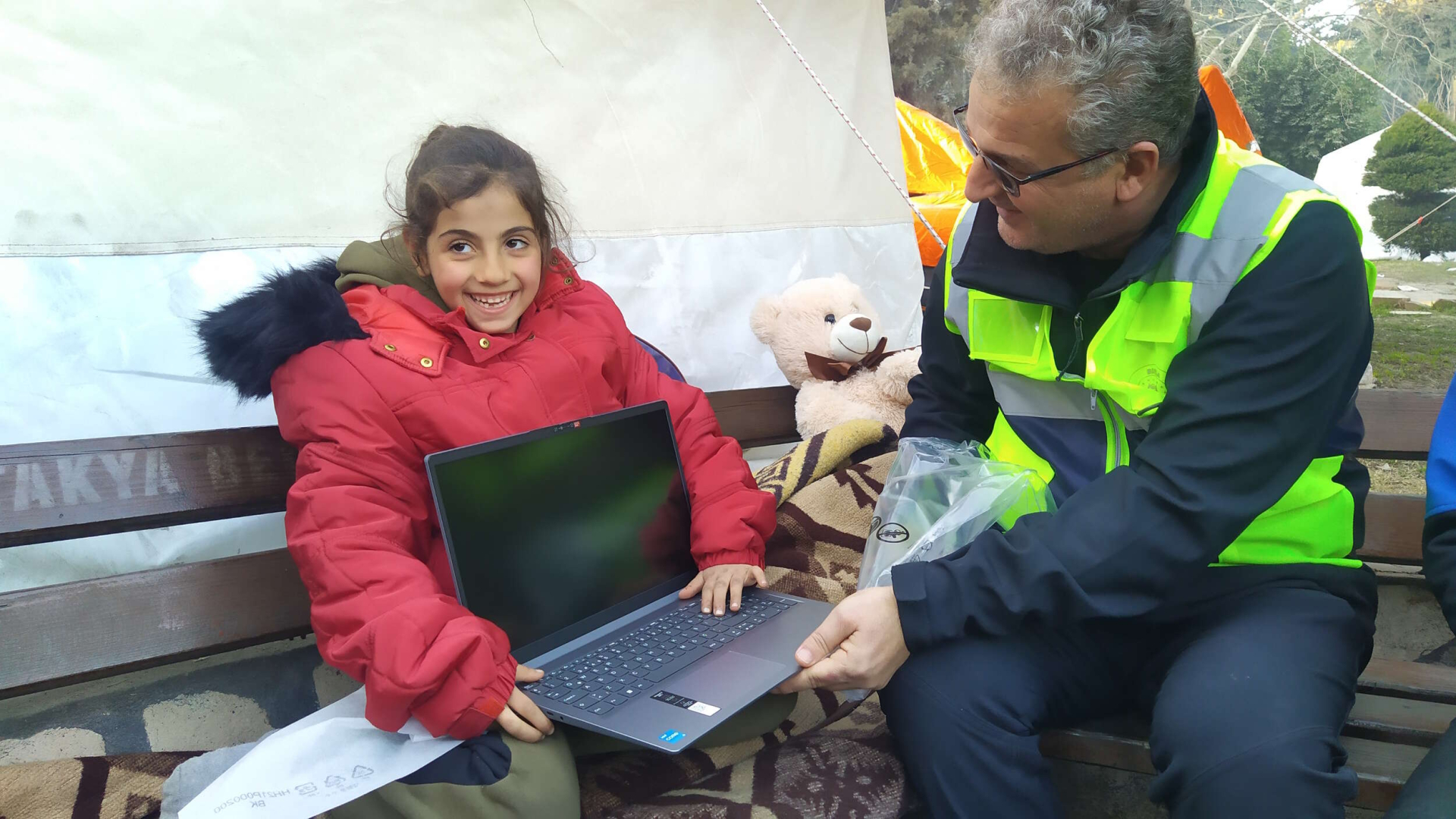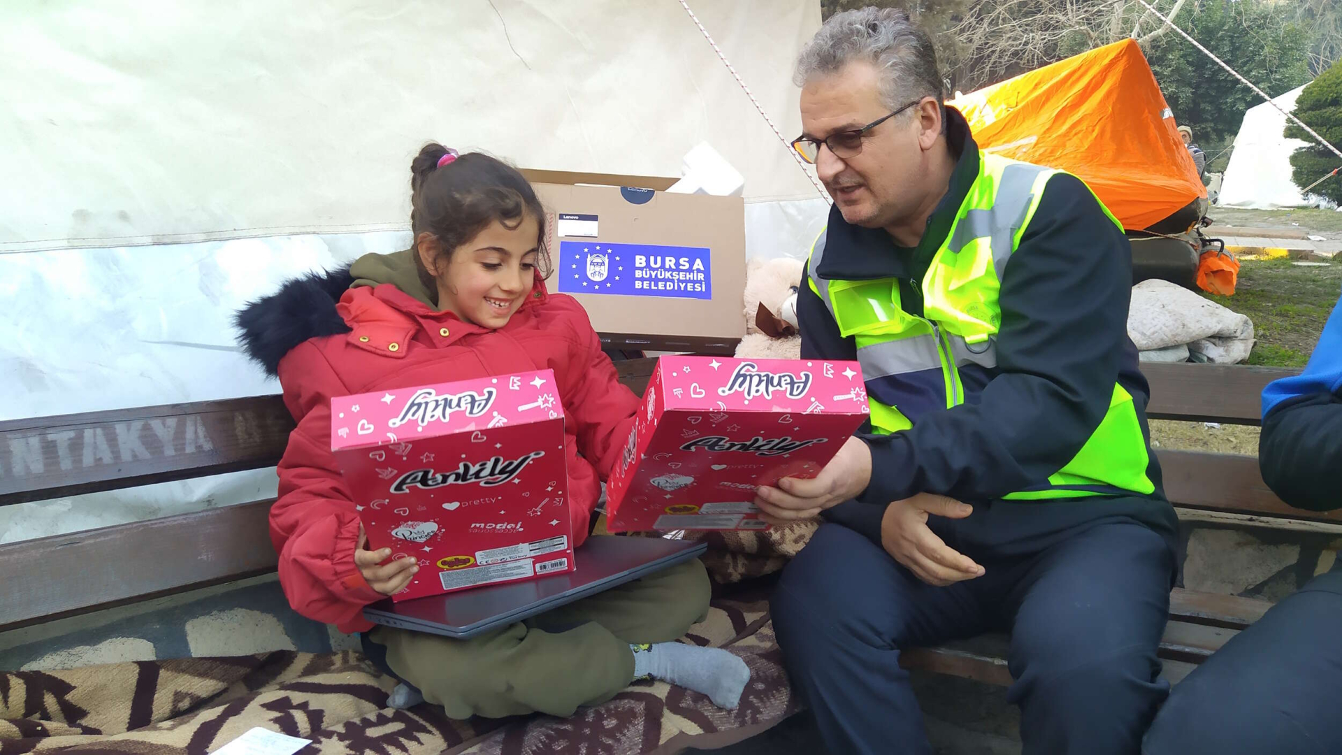 Hatay’da deprem mağduru vatandaşların yaralarını sarmak için mahalle mahalle gezerek yardımlarını ulaştıran Bursa Büyükşehir Belediyesi ekipleri, depremzede miniklerin yüzünü güldürmeye devam ediyor. Evlerinin yıkılması sonucu çadırda kalan 7 yaşındaki Melek’in bilgisayar isteğine duyarsız kalamayan Büyükşehir Belediyesi ekipleri, minik kızı ziyaret edip istediği bilgisayarı teslim ederek yüzünü güldürdü.