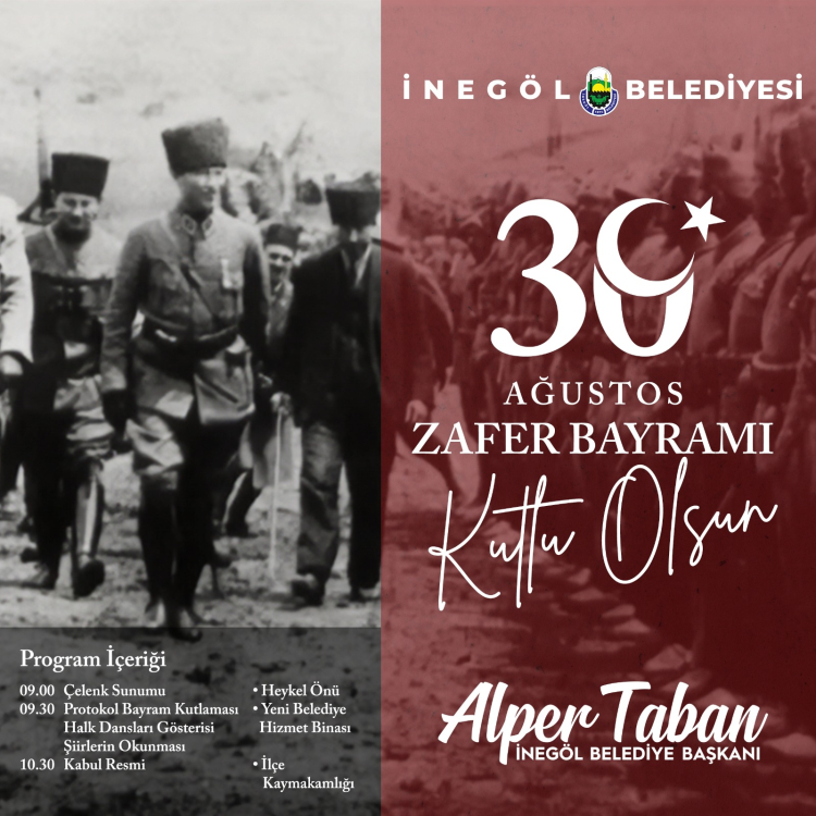 İnegöl Belediye Başkanı Alper Taban, 30 Ağustos Zafer Bayramının yıl dönümü nedeniyle yazılı bir açıklama yaparak büyük zaferin 102’nci yılını kutladı. Başkan Taban, Anadolu’yu düşman çizmelerine ezdirmeyen kahramanların ilelebet hatırlanacağını ve rahmetle yad edileceğini ifade ederek, kutlu zaferin gururunu yaşadıklarını söyledi.