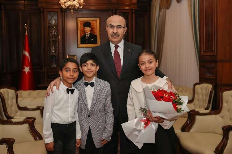 Türkiye Büyük Millet Meclisinin açılışının 104. yıl dönümü ve 23 Nisan Ulusal Egemenlik ve Çocuk Bayramı kutlamaları münasebetiyle İl Milli Eğitim Müdürü Dr. Ahmet Alireisoğlu ile Gülhanım Karasu İlkokulu öğretmen ve öğrencileri, Vali Mahmut Demirtaş’ı makamında ziyaret etti.