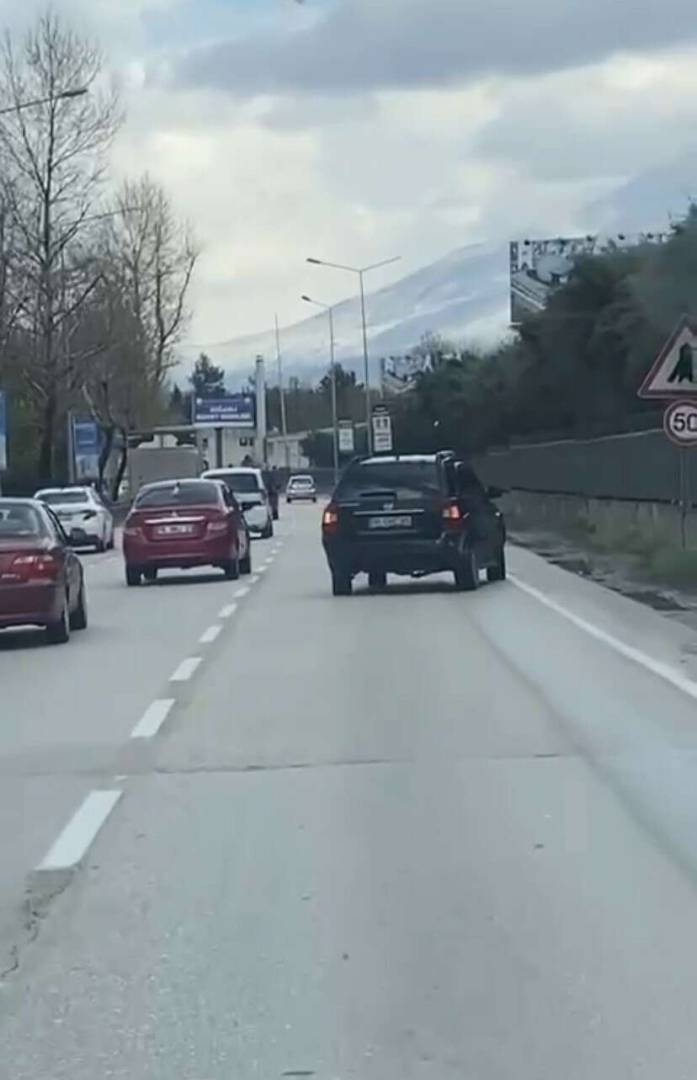 Bursa’da yan yan giden cip, trafikteki başka bir sürücünün cep telefon kamerasına yansıdı.