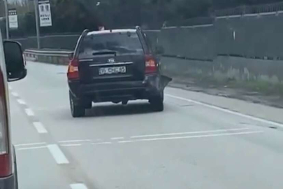 Cip ise lastiklerinin yamukluğu sebebiyle yan yan giderken o anlar trafikteki başka bir sürücünün cep telefon kamerasına yansıdı.