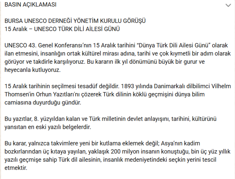 Bursa UNESCO Derneği Yönetim Kurulu, UNESCO’nun 15 Aralık tarihini “Dünya Türk Dili Ailesi Günü” olarak ilan etmesinin ilk yıl dönümü dolayısıyla bir basın açıklaması yayımladı. Açıklamada, kararın insanlığın ortak kültürel mirası açısından tarihi bir adım olduğu vurgulandı.