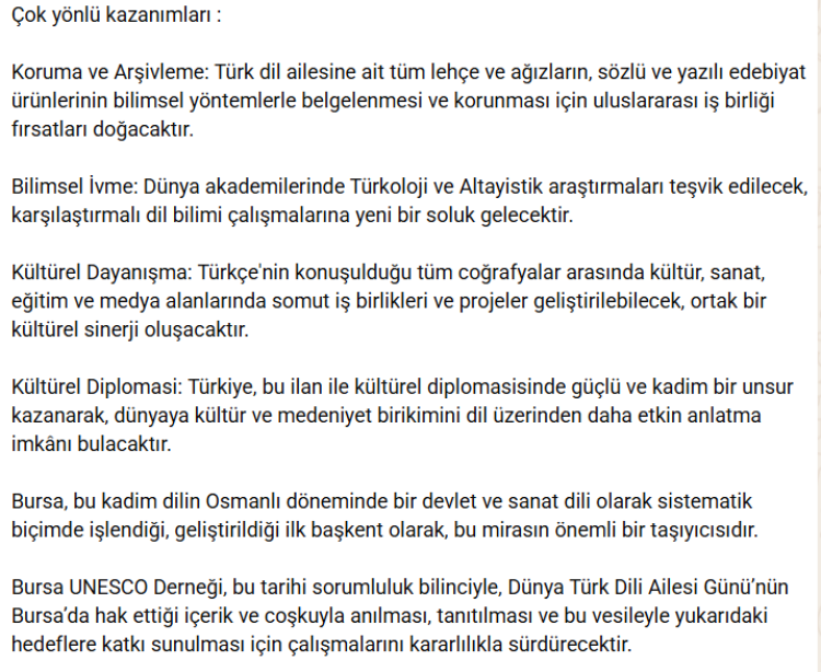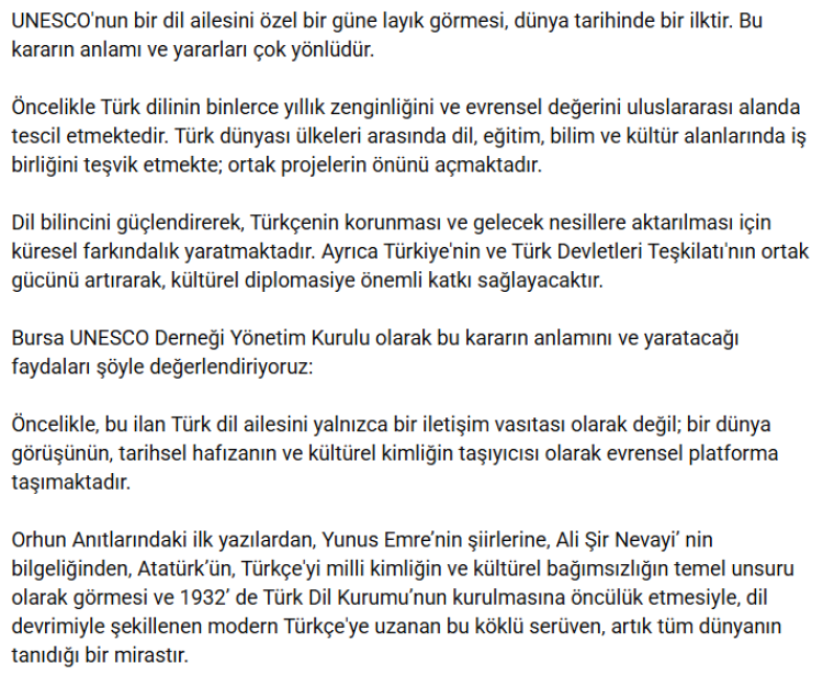 UNESCO'nun "Dünya Türk Dili Ailesi Günü" ilanının birinci yıldönümünde Bursa UNESCO Derneği açıklama yaptı. Karar "tarihi ve kültürel miras" için önemli bir adım olarak değerlendirildi ve Türk dili ailesinin zenginliğine vurgu yapıldı.