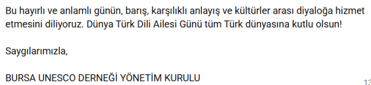 Açıklama, Dünya Türk Dili Ailesi Günü’nün barışa, karşılıklı anlayışa ve kültürler arası diyaloğa katkı sunması temennisiyle sona erdi.