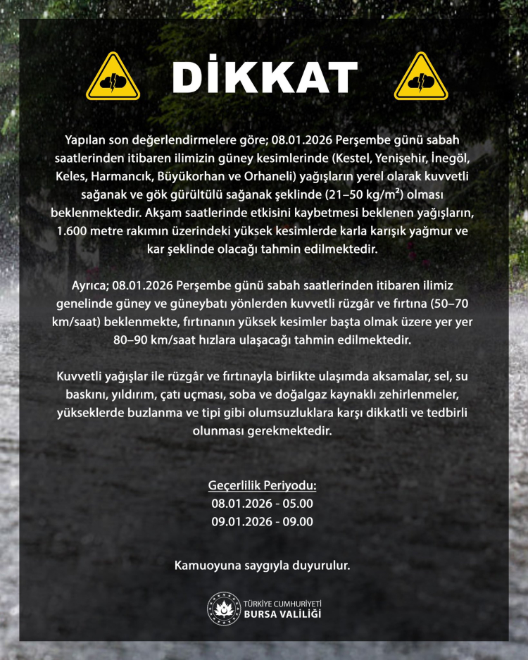 Bursa Valiliği, 8 Ocak 2026 Perşembe günü sabah saatlerinden itibaren başlayacak olan kuvvetli sağanak yağış ve şiddetli fırtınaya karşı vatandaşları uyardı.