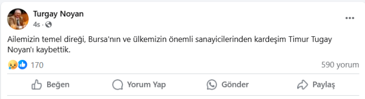 Bursalı iş insanı, Berteks Şirketler Grubu Yönetim Kurulu Başkanı ve Bursaspor Kulübü eski yöneticilerinden Timur Tugay Noyan hayatını kaybetti.