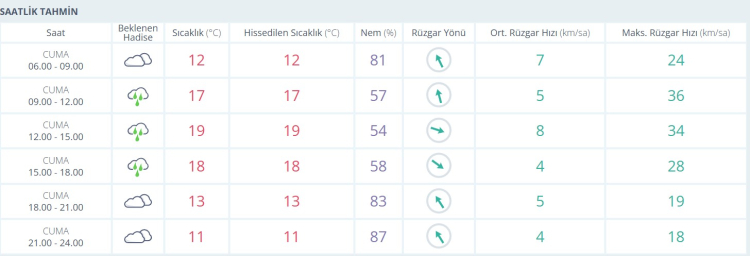 İşte saatlik tahmin tablosu: