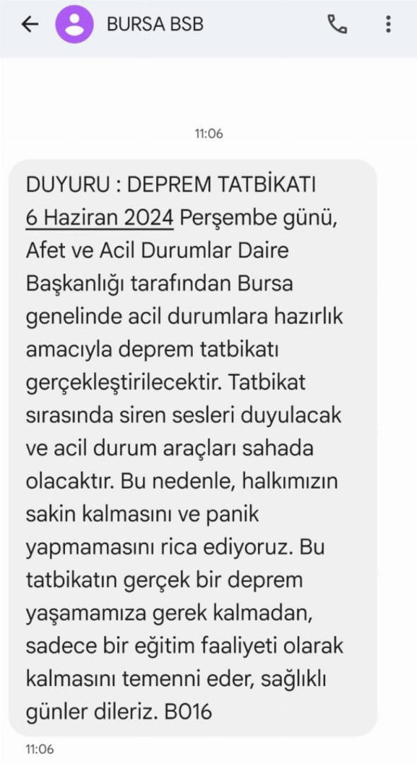 Bursa Büyükşehir Belediyesi, vatandaşları AFAD tarafından yapılacak deprem tatbikatı öncesinde gönderdiği SMS ile uyardı. Yapılan uyarıda şu cümlelere yer verildi:
