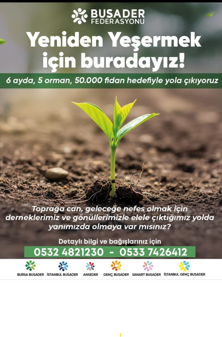 2024 - 2026 dönemi 2 yıllık programlarında ele aldıkları 'Sürdürülebilirlik' konusunda önemli çalışmalar yapan BUSADER Federasyonu “Yeniden Yeşermek İçin Buradayız” sloganıyla, 6 ayda 5 orman 50 bin fidan hedefiyle yola çıktı. Federasyona bağlı tüm derneklerin aktif şekilde yer alacağı ağaçlandırma kampanyası ile ilk orman, yangınlardan çokça etkilenen Bursa’da gerçekleştirilecek.
