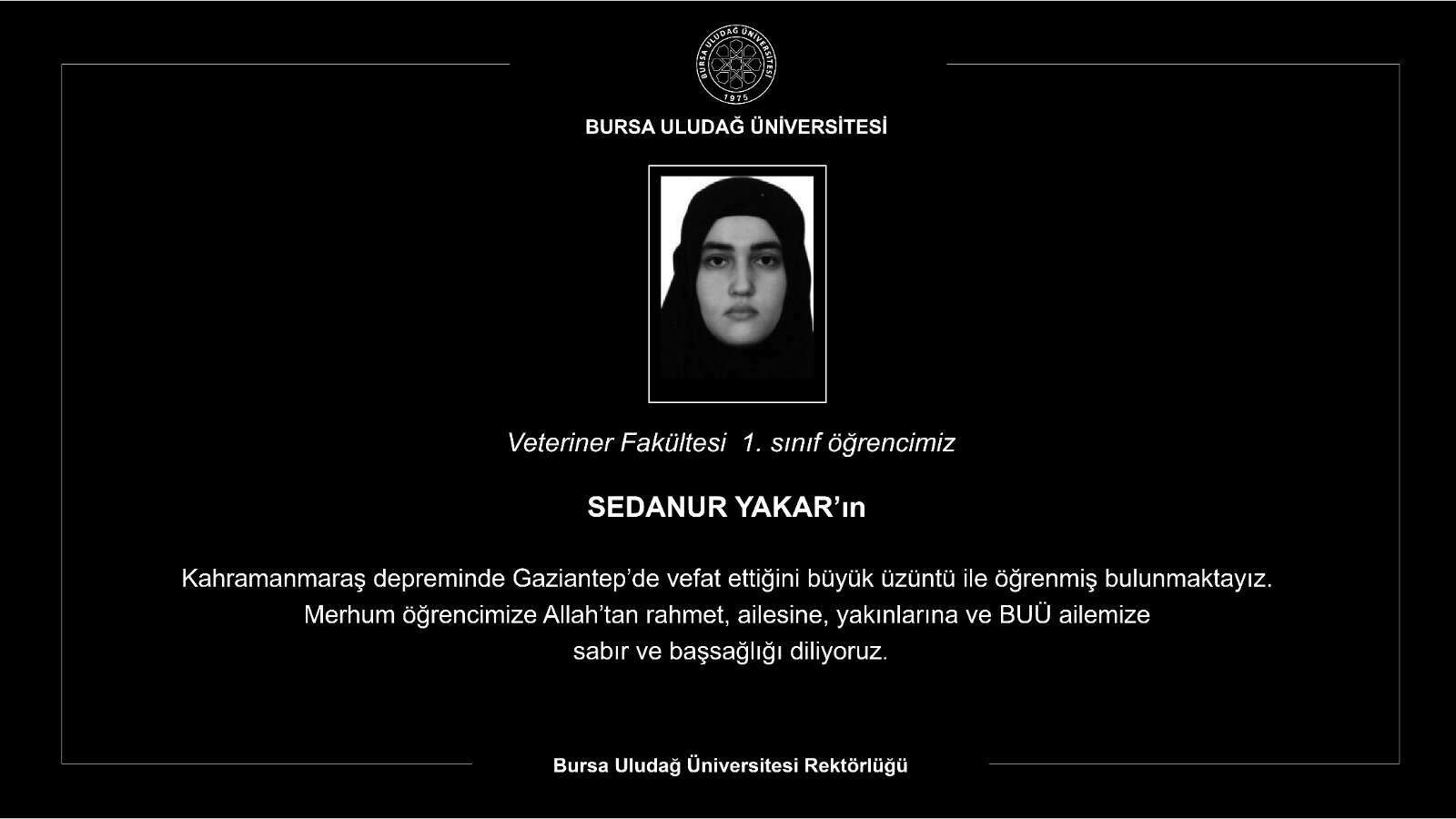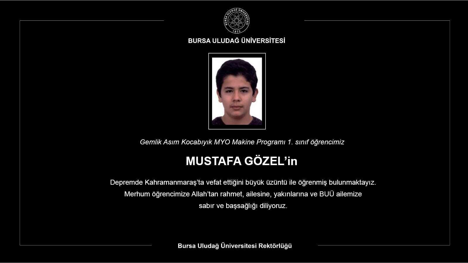 Üniversitenin yürüttüğü kayıp belirleme çalışmalarında depremin merkez üssü olan Kahramanmaraş’ta BUÜ’de eğitim gören 2 öğrencinin vefat ettiği belirlendi. Mimarlık Fakültesi Mimarlık Bölümü öğrencisi Fazlı Açıkgöz ile Gemlik Asım Kocabıyık Meslek Yüksekokulu Makine Programı öğrencisi Mustafa Gözel, Maraş’ta hayatını kaybederken; Mühendislik Fakültesi İnşaat Mühendisliği Bölümü öğrencisi Alperen Aksan’ın Antakya Hatay’da; Veteriner Fakültesi öğrencisi Sedanur Yakar’ın ise Gaziantep’te vefat ettiği bilgisine ulaşıldı. Kayıplar Üniversite Yönetimi tarafından teyit edildi. Öğrencilerin arkadaşları ile akademik ve idari personelin de büyük bir üzüntü yaşadığı aktarıldı.