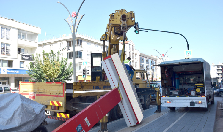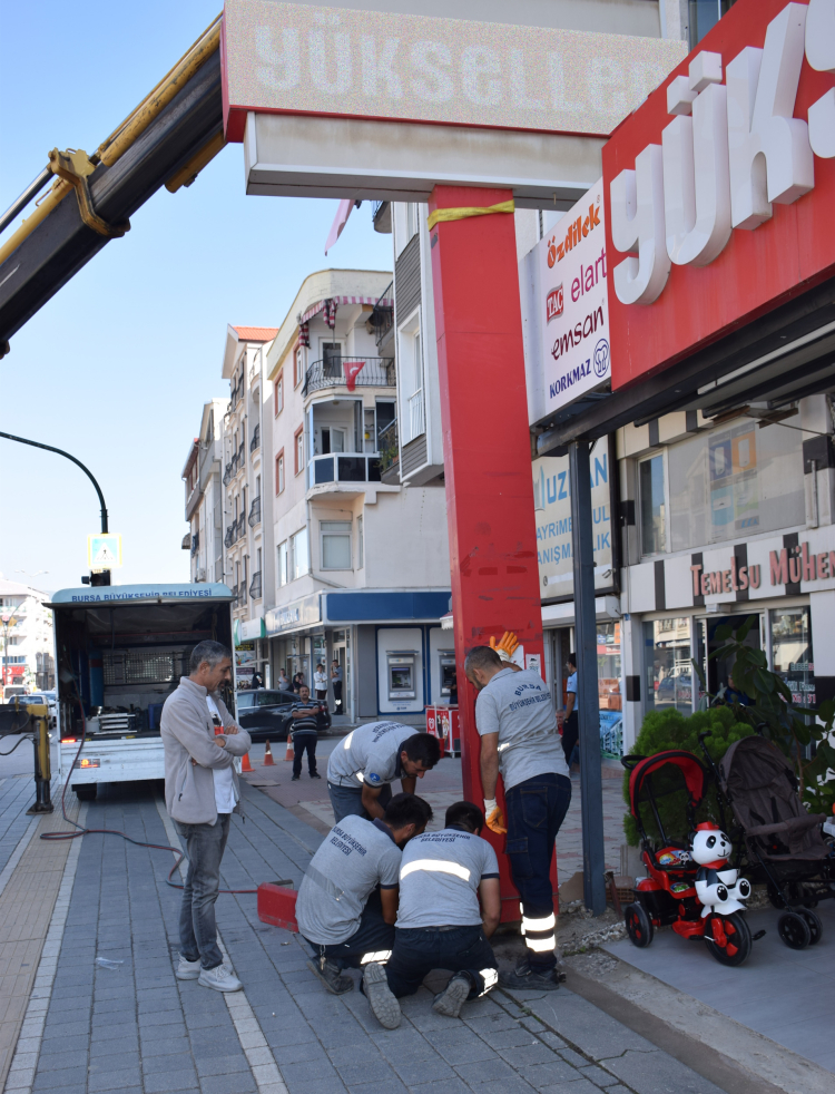 Kenti daha estetik ve yaşanabilir hale getirmek için çalışmalarını sürdüren Bursa Büyükşehir Belediyesi, Şehit Cüneyt Yıldız Caddesi’nde yönetmeliğe uymayan tabela, afiş ve totemleri kaldırdı.