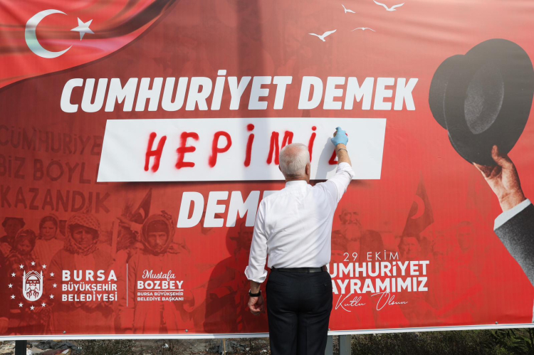 Kampanyaya ‘Cumhuriyet demek, hepimiz demek’ diyerek katılan Bursa Büyükşehir Belediye Başkanı Mustafa Bozbey de sloganını billboarda sprey boyayla yazdı. 29 Ekim’de Cumhuriyet Bayramı coşkusunu yaşamak için tüm Bursalıları alanlara davet eden Başkan Mustafa Bozbey, “Cumhuriyet demek, hepimiz demek. Cumhuriyet demek, aydınlanma demek.