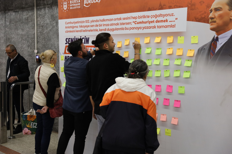 Bursa Büyükşehir Belediyesi’nin Cumhuriyet’in 102. yılına özel başlattığı ‘Cumhuriyet demek…' kampanyası yoğun ilgi gördü. Başkan Mustafa Bozbey, “Cumhuriyet demek, hepimiz demek” sloganıyla katıldı. Vatandaşların sözleri billboardlarda sergilendi.