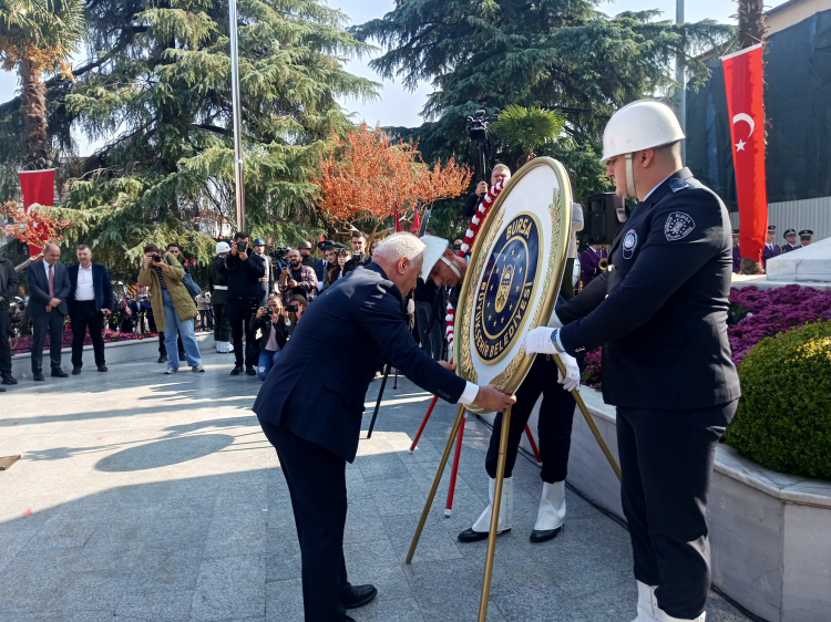 Törende Bursa Valisi Erol Ayyıldız, Bursa Büyükşehir Belediye Başkanı Mustafa Bozbey, Bursa Garnizon Komutanı Tuğgeneral Birol Arslan tarafından çelenk sunuldu. Gazi Mustafa Kemal Atatürk, silah arkadaşları ve vatan şehitleri için saygı duruşu ve İstiklal Marşı okunmasıyla tören sona erdi.