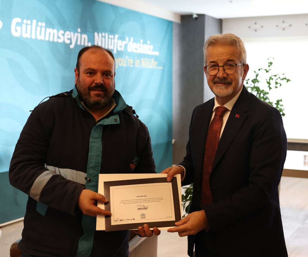 Nilüfer Belediyesi Veteriner İşleri Müdürlüğü’nün sahada çalışanlara yönelik düzenlediği Hayvan Hakları Davranışları ve Refahı Eğitimi’ni başarıyla tamamlayanlar, sertifikalarını Nilüfer Belediye Başkanı Turgay Erdem’in elinden aldı.
