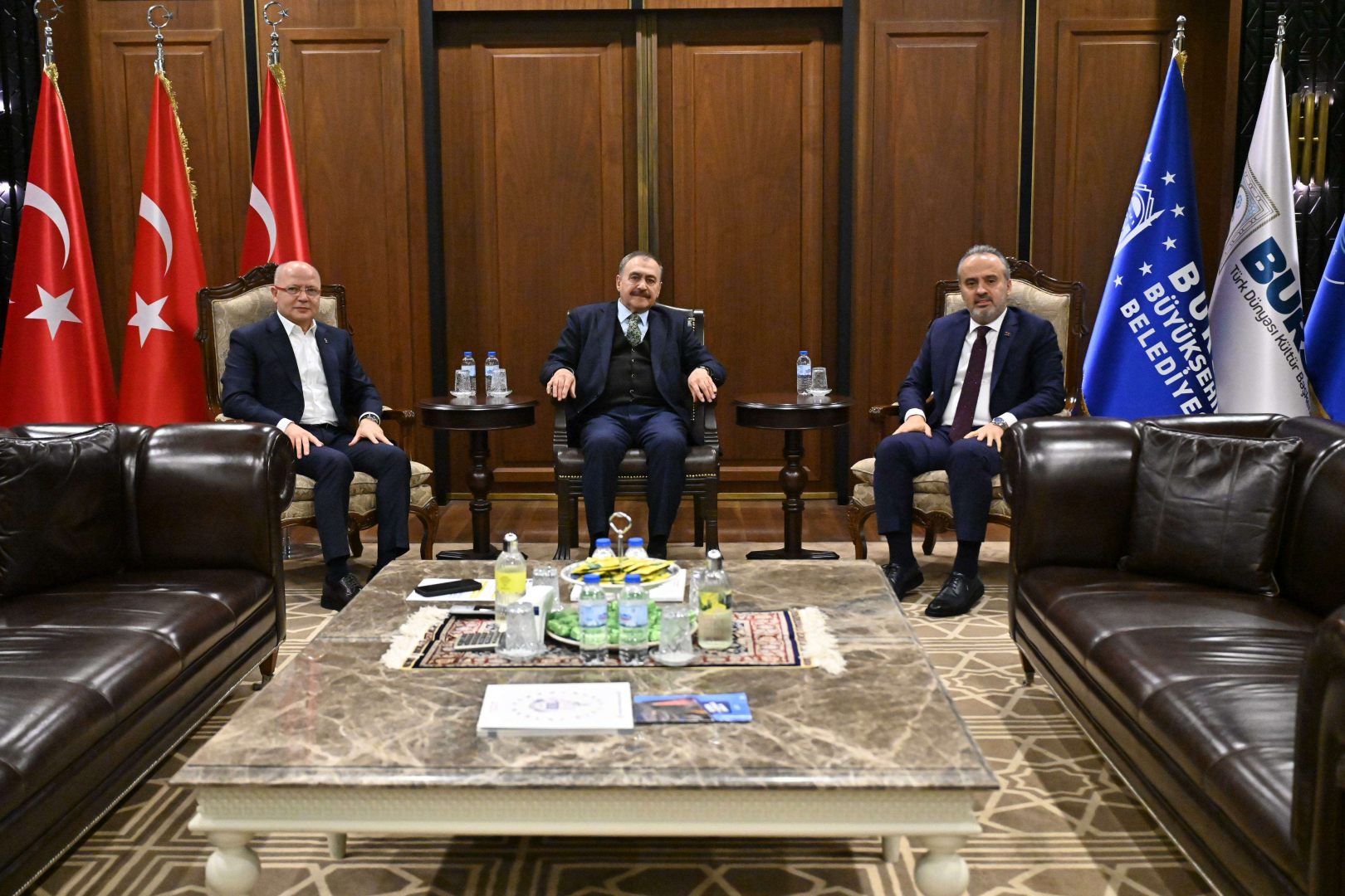Bursa Büyükşehir Belediye Başkanı Alinur Aktaş, Eski Orman ve Su İşleri Bakanı Prof. Dr. Veysel Eroğlu’nu makamında ağırlayarak yapılan ve yapılacak olan projeler hakkında fikir alışverişinde bulundu.