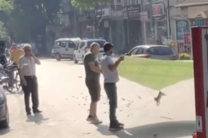 Şans eseri esnafların açtığı brandaya düşen kedi sonrasına kaçarak gözden kayboldu. O anlar amatör kameraya yansıdı.
