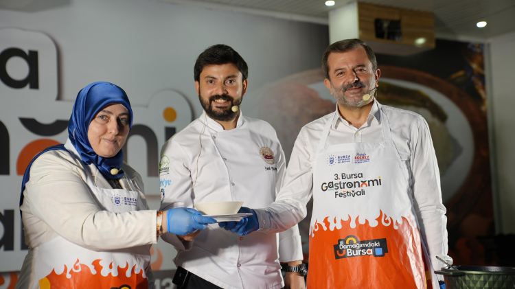 Bursa’nın lezzetlerini ilçelerle buluşturmak ve Bursalıları festivale davet etmek amacıyla Büyükşehir Belediyesi tarafından ilçelerde gezdirilen Gastronomi Tırı’nın yeni durağı Gürsu oldu. Belediye Başkanı Mustafa Işık ve Eşi Sümeyye Işık tarafından sahnede özel bir mutfakta hazırlanan menü ile Gürsu’nun lezzetleri tanıtıldı. Akademisyen Şef Fatih Yıldırım, Bursa Aşçılar Derneği Kadın Kolları Başkanı Tülay Dönmez, Eğitmen Şef Selin Sekizkardeşler ve Eğitmen Şef AybiçeTaylak’ın yardımları ile anlatılan menüde Gürsu bamyasından bamya çorbası, hinkal ve armutlu kurabiye yapıldı.