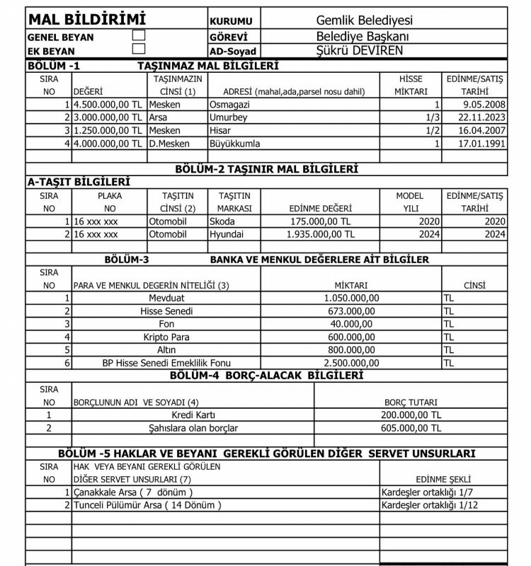 Gayrimenkul, otomobil, hisse senedi ve mevduat hesabı gibi çeşitli taşınmazların bulunduğu mal beyanı, yılları ve o yıl ki sahip olduğu değerleri de içerisinde barındırırken, Gemlik Belediye Başkanı Şükrü Deviren tarafından 29 Nisan 2024 tarihinde imza altına alındı.