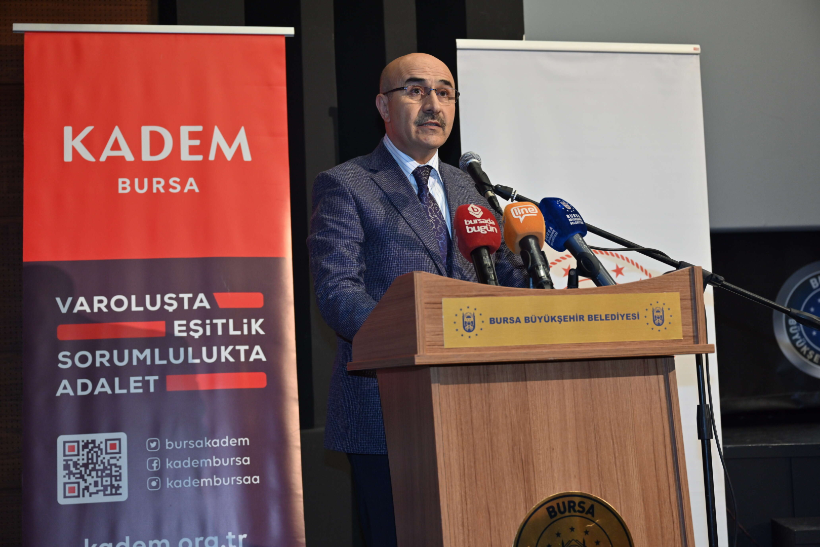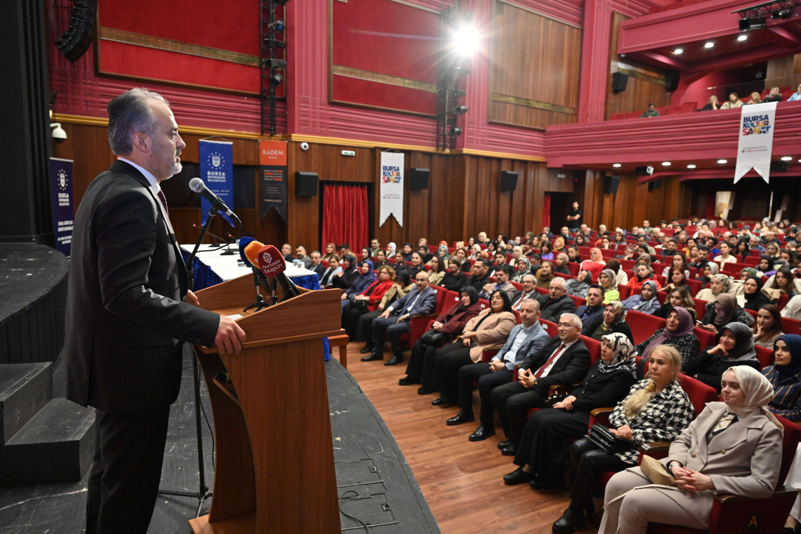 Bursa Valisi Mahmut Demirtaş da, “Bugün her birimiz tüm dünyada kadına yönelik şiddet başta olmak üzere şiddetin her türlüsünün son bulduğunu, insanların huzur, güven ve mutluluk içerisinde yaşadığını duymak ve görmek isterdik. Ancak uzak yakın, farklı coğrafyalardan şiddet haberleri almaya devam ediyoruz. İşte yanı başımızda Gazze'de dünyanın gözü önünde bir insanlık dramı yaşanıyor. Kadınlar, çocuklar, yaşlılar katlediliyor, şehadete gidiyor. Savaş kötü yüzünü maalesef yine en çok kadınlara ve çocuklara gösteriyor. Buradan bir kez daha Gazzeli hayatını kaybeden kadınlara, çocuklara, tüm kardeşlerimize Allah'tan rahmet, yaralılara acil şifalar diliyorum. Kadına yönelik şiddet, şiddet türbenin içerisinde en aciz ve en çirkin olanıdır. Buradan herkesi bir kez daha şiddete karşı sıfır tolerans ilkesiyle yaklaşım sergilemeye davet ediyorum. Devletimiz bu noktada kadına yönelik şiddet başta olmak üzere şiddetin her türünün önüne geçmek için farklı tedbirler almakta, farklı projeler hayata geçirmektedir. Maalesef alınan tüm tedbirlere ve yürütülen çalışmalara rağmen kadına yönelik şiddet gündemin üst sıralarındaki yerine korumaktadır. Bizler de şiddeti kent gündeminden düşürmek için çalışmalarımızı yoğun bir biçimde sürdürüyoruz. Gelecek nesillerin bizim üzerimize bina olduğunu, dolayısıyla çocuklarımızı en iyi şekilde yetiştirmemiz gerektiğini unutmayalım. Evlatlarımızı kız, erkek ayrımı yapmaksızın insan merkezli yetiştirmeliyiz. Daha güçlü, daha müreffeh bir Türkiye'nin ve Türkiye yüzyılının vizyonunun en önemli aktörü kadınlarımızdır. Ve biliyoruz ki kadınlarımıza her alanda sağlayacağımız imkanlar ülkemize ve kentimize değer katacaktır. Bu vesileyle bir kez daha tüm dünyada kadınlara yönelik şiddetin tamamen ortadan kaldırılmasına yönelik duyarlılık ve farkındalık oluşturmasını diliyorum” diye konuştu.