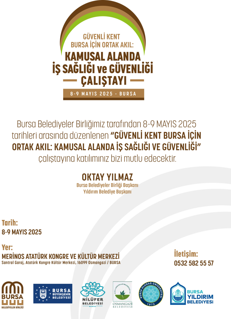 Bursa Belediyeler Birliği, kamusal alanlardaki iş sağlığı ve iş güvenliği alanlarında, yeni yaklaşımlar ortaya koymak, belediyeler arasındaki iş birliğini ve kamusal verimliliği arttırmak için ‘Kamusal Alanlarda İş Sağlığı ve İş Güvenliği Çalıştayı düzenliyor. 8-9 Mayıs tarihlerinde Merinos Atatürk Kongre Kültür Merkezi’nde, Bursa Belediyeler Birliği ve Yıldırım Belediye Başkanı Oktay Yılmaz’ın ev sahipliğinde gerçekleştirilecek çalıştaya, birliğe üye belediye başkanları ve kamu kurum ve kuruluşlarının temsilcileri, STK temsilcilerinin yanı sıra uzmanlar katılacak. Çalıştay masalarında görev alan alanında uzman 150’nin üzerinde katılımcı ile Kamusal Alanlarda İş Kazaları, İSG Teknolojileri ve Dijital Çözümler, Acil Durum Yönetimi ve Planlaması Psikososyal Riskler, Meslek Hastalıkları ve Çalışan Sağlığı gibi 9 farklı başlık masaya yatırılacak.