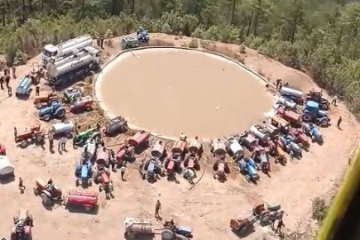 Yangına hem havadan hem de karadan müdahale edilirken, en çarpıcı görüntülerden biri helikopterden kaydedildi. Helikopter su almak için alçaldığı sırada havuzun etrafında sıralanmış yüzlerce yangın söndürme tankeri dikkat çekti. Ancak havuzdaki su tükenince tankerler bu kez helikopterlere su taşıma görevini üstlendi. Onlarca tanker havuzu yeniden doldurarak helikopterlerin kesintisiz çalışmasına destek verdi. Çiftçilerin oluşturduğu traktörlü tanker ordusu ise, söndürme helikopterinden görüntülendi.