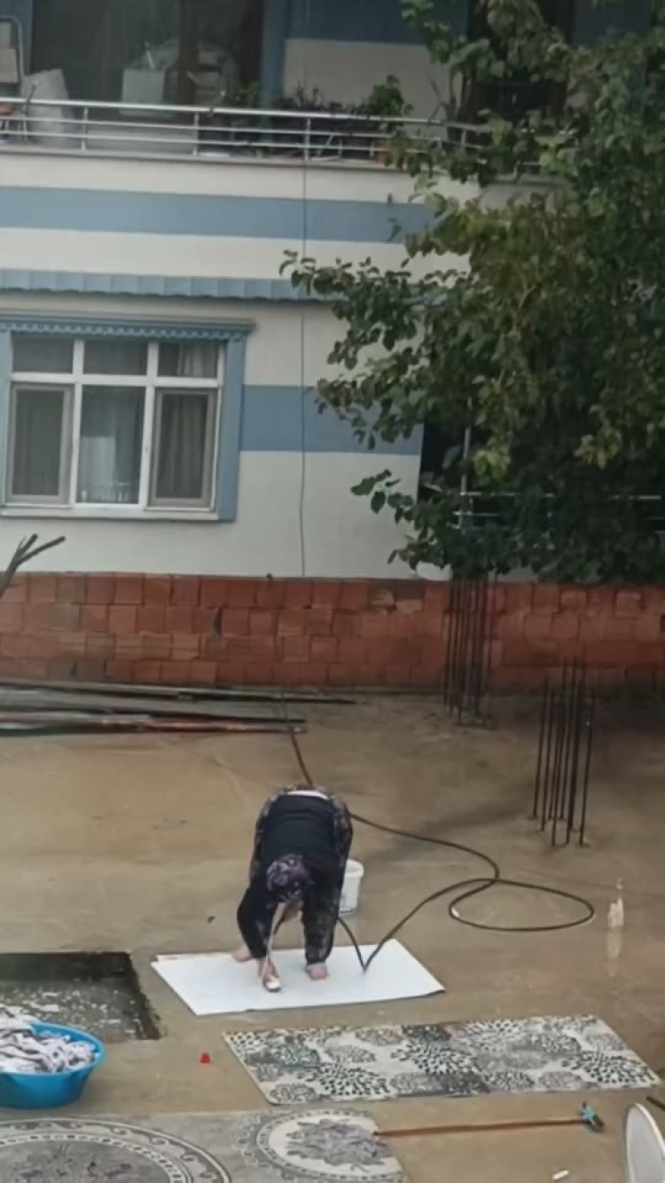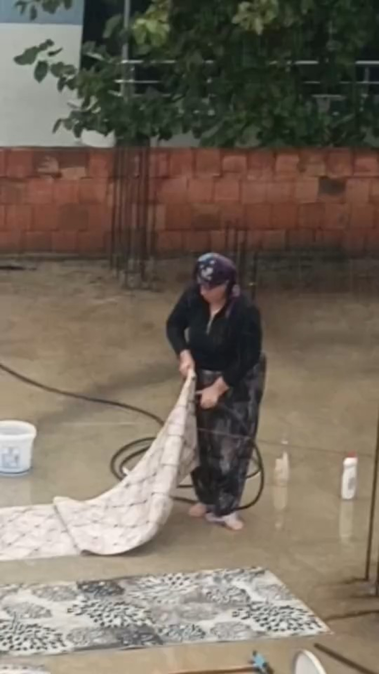 Belediyenin uyarısı ve kesintilere rağmen bir kadın apartman çatısında halı yıkarken görüntülendi. İlginç anlar çevredeki vatandaşların dikkatinden kaçmadı. Yağmurun altında çatıda halı yıkayan kadını görenler, o anları cep telefonlarıyla kaydetti.