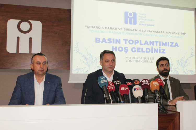 İnşaat Mühendisleri Odası (İMO) Bursa Şubesi Yönetim Kurulu Başkanı Serdar Atilla Erdem, Çınarcık Barajı ve Bursa'nın Su Kaynaklarının Yönetimi” hakkında basın açıklaması yaparak "Çınarcık Barajı Bursamızın Can Suyudur Dokunma" dedi.