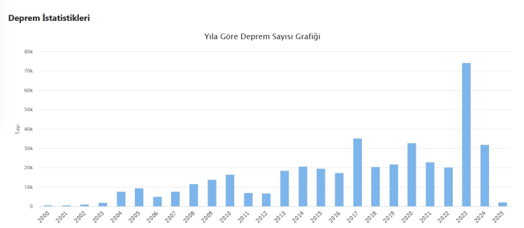 Deprem istatistiklerine göre ortalama her altı yılda bir büyüklüğü 7 veya üzeri, her yıl iki adet 6 veya üzeri bir deprem meydana gelmekte ve ne yazık ki bu depremler önemli can ve mal kayıplarına yol açmaktadır. Türkiye’de her yıl ortalama 25 bin civarında deprem olduğu, 6 Şubat Depremlerinin artçı yoğunluğu nedeniyle 2023 yılında 74.232, 2024 yılında ise 31.890 deprem meydana geldiği bilinmektedir. Bu veriler, ülkemizin depremselliğinin açık bir göstergesidir. Asıl şaşırtıcı olan, deprem olaylarına aşina olmamıza karşın depreme yönelik hazırlıklarımızın bu kadar geri kalmasıdır.”