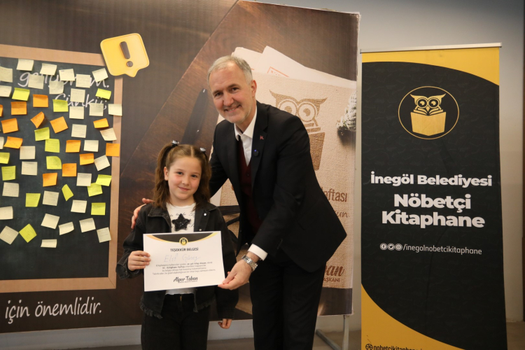 İnegöl Belediyesi’nin örnek projelerinden olan ve 30 bin aktif üye ile günlük 800 ila bin öğrencinin kullandığı Nöbetçi Kitaphanelerde Kütüphaneler Haftası etkinlikleri kapsamında artık geleneksel hale gelen Kitaphane En’lerinin Ödüllendirilmesi programı Cumartesi günü gerçekleştirildi. Yeni Yaşam Alanı ve Kent Meydanı içerisinde bulunan D Blok Nöbetçi Kitaphanede yapılan törende, Nöbetçi Kitaphanelerin “En Çok Kitap Okuyan” ve “En İyi Kullanıcı” ödüllerini almaya hak kazanan öğrencilere ödül takdimini Belediye Başkanı Alper Taban yaptı.