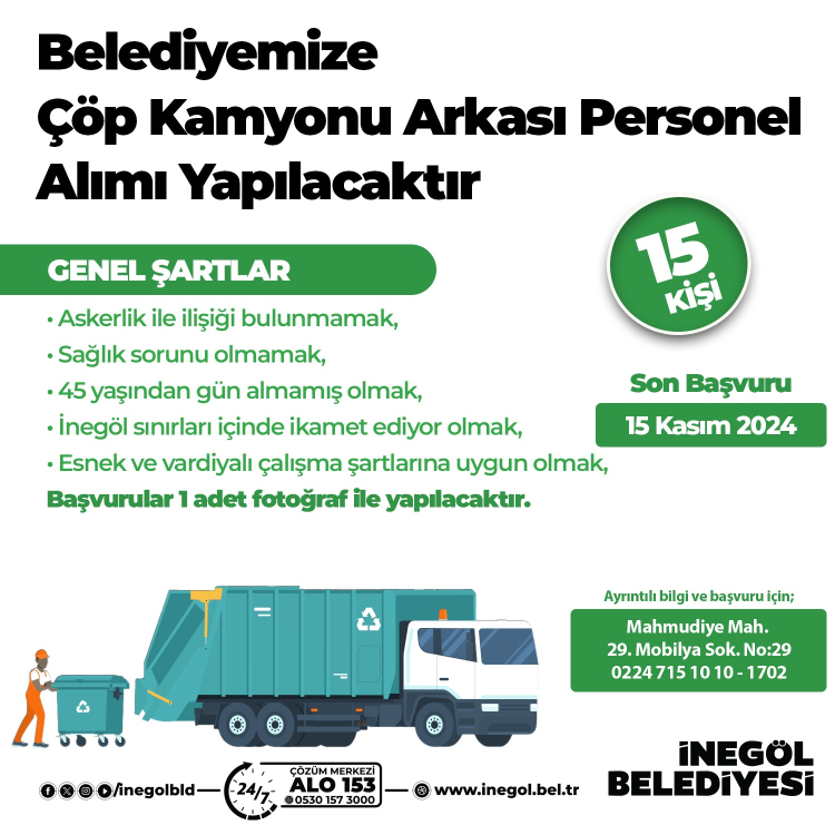 İnegöl Belediyesi’nin personel alımına ilişkin yapılan açıklamada şu ifadelere yer verildi: “Kurumumuz bünyesinde istihdam edilmek üzere temizlik hizmetlerinde görevlendirilecek personel alımı yapılacak. İlçe halkımıza en iyi hizmeti sunmak adına yapılan alım kapsamında çöp kamyonu arkasında çalışacak 15 personel istihdam edilecek. Başvuruda bulunmak isteyen vatandaşlarımız 15 Kasım Cuma günü mesai bitimine kadar Mahmudiye Mahallesi 29. Mobilya Sokak N0:29 adresinde Temizlik İşleri Müdürlüğü Hizmet Binasına gelerek bizzat başvuru yapabilecek.”
