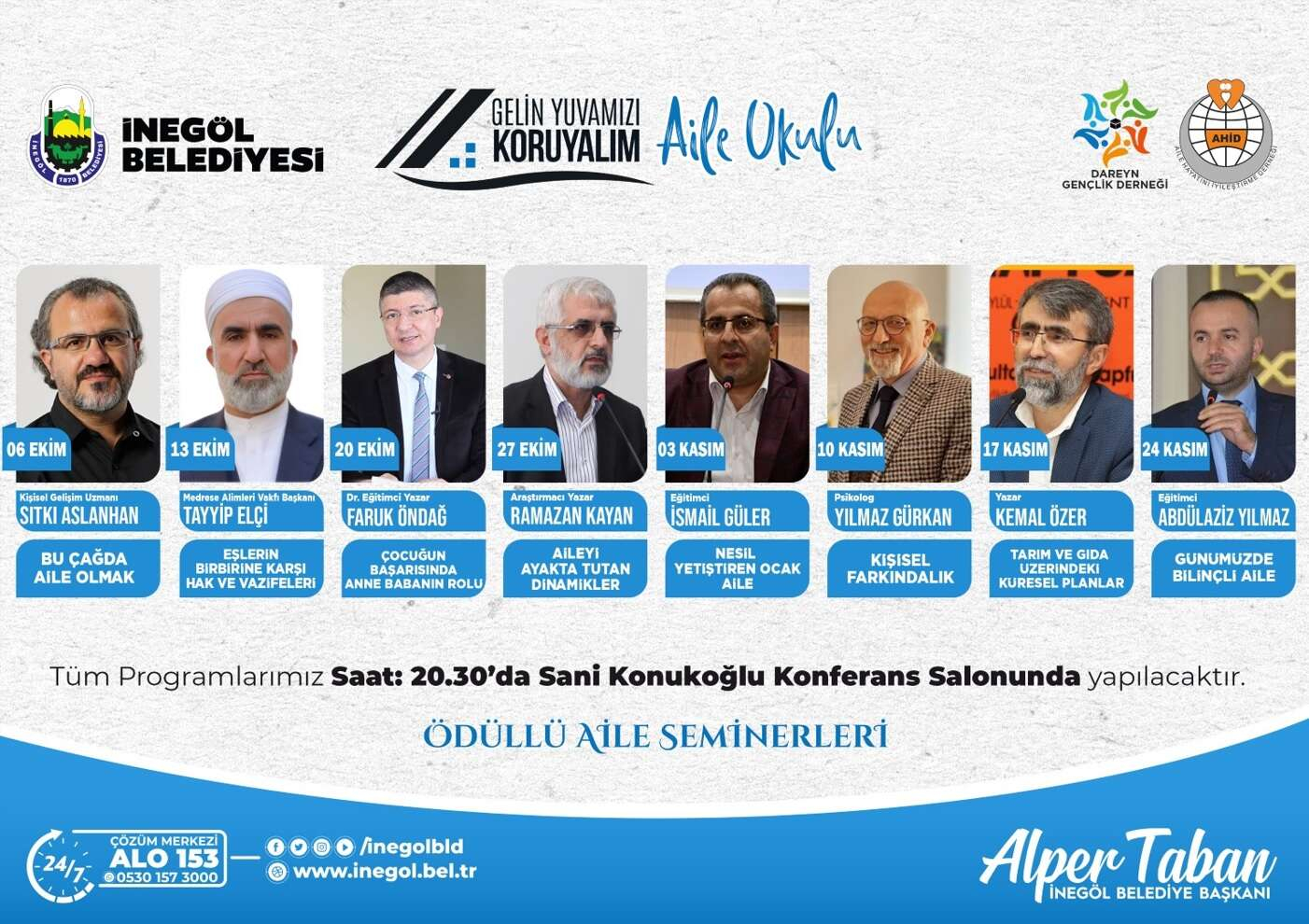 “6 Ekim’de Kişisel Gelişim Uzmanı Sıtkı Aslanhan “Bu Çağda Aile Olmak” semineri, 13 Ekim’de Medrese Alimleri Vakfı Başkanı Tayyip Elçi hocamız “Eşlerin Birbirlerine Karşı Hak ve Vazifeleri”, 20 Ekim’de Eğitimci Yazar Dr. Faruk Öndağ “Çocuğun Başarısında Anne Babanın Rolü” semineri, 27 Ekim’de Araştırmacı Yazar Ramazan Kayan “Aileyi Ayakta Tutan Dinamikler” semineri, 03 Kasım’da Eğitimci İsmail Güler “Nesil Yetiştiren Ocak, Aile” semineri, 10 Kasım’da Psikolog Yılmaz Gürkan “Kişisel Farkındalık” semineri, 17 Kasım’da Yazar Kemal Özer “Tarım ve Gıda Üzerindeki Küresel Planlar” semineri ve 24 Kasım’da Psikohekim Abdülaziz Yılmaz “Günümüzde Bilinçli Aile” semineri gerçekleştirilecek. Yapılacak tüm bu seminerler, aile kurumunun muhafazası için çok önemli konuların işleneceği eğitimler. Tüm seminerler her hafta Cuma akşamları 20.30’da Sani Konukoğlu Konferans salonunda yapılacak. Bu vesileyle ben özellikle gençlerimizi, yeni evlenecek veya yeni evlenmiş çiftlerimizi Aile Okuluna davet ediyorum.”
