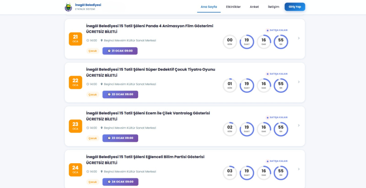 Bu sistem sayesinde vatandaşlar, etkinliklere yönelik bilgilere hızlı erişebiliyor; bilet alma sürecini internet üzerinden tamamlayabiliyorlar. Platformda etkinlikler “Çocuk”, “Kültür-Sanat”, “Konser”, “Tiyatro” ve “Söyleşi” gibi kategoriler halinde filtrelenebiliyor. Etkinlik portalı, İnegöl Belediyesi’nin dijital altyapı ve hizmetlerini güçlendirme çalışmaları çerçevesinde de önemli bir adım olarak öne çıkıyor.