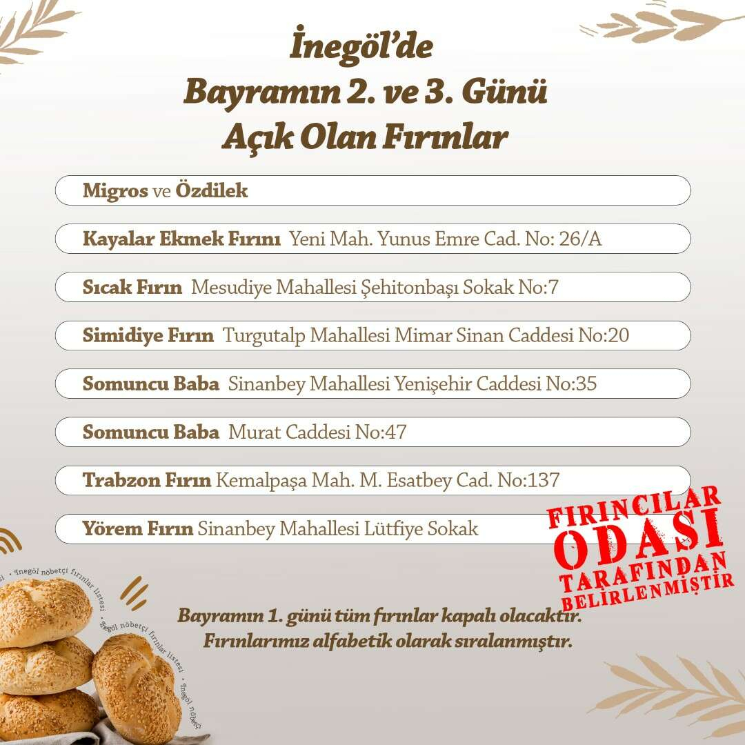 “Buna göre; bayramın ikinci ve üçüncü günü İnegöl’de Sinanbey Mahallesi Lütfiye Sokak’ta hizmet veren Yörem Fırın, Mesudiye Mahallesi Şehitonbaşı Sokak No:7’de hizmet veren Sıcak Fırın, Kemalpaşa Mahallesi Mahmut Esatbey Caddesi No:137/A’da hizmet veren Trabzon Fırın, Turgutalp Mahallesi Mimar Sinan Caddesi No:20’de hizmet veren Simidiye Fırın, Sinanbey Mahallesi Yenişehir Caddesi No:35 ve Murat Caddesi No:47’de hizmet veren Somuncu Baba fırınları, Alanyurt Yeni Mahalle Yunusemre Caddesi No:26/A’da hizmet veren Kayalar Ekmek Fırını ile Özdilek ve Migros marketlerin fırın bölümleri ekmek üretimi yapacaktır.”