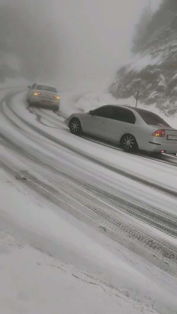 Kar yağışı nedeniyle İnegöl-Domaniç yolu araç trafiğine kapatıldı. Bazı araçlar yolda kalırken, zincir ve kış lastiği takan araçların geçişine izin veriliyor. Bir sürücü, yolda kalan araçları görüntüleyip, diğer sürücüleri kar lastiği ve zincir kullanmaları konusunda uyardı.