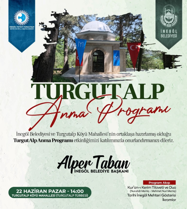 İnegöl Belediyesi ile Turgutalp Köy Mahallesi’nin iş birliğiyle, Osmanlı’nın kuruluş döneminin önemli isimlerinden ve İnegöl’ün Fatihi Turgut Alp için 22 Haziran Pazar günü saat 14.00’te Turgut Alp Türbesi’nde anma programı düzenlenecek. İnegöl Belediye Başkanı Alper Taban anma programına tüm ilçe halkını davet etti.